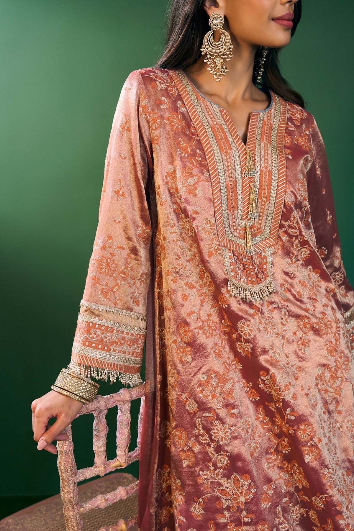 A set that feels equal parts festive and effortless. The kurta is cut in an easy A-line silhouette, crafted from lightweight tissue fabric that lends just the right amount of sheen. Its deep fuschia base is paired with orange tissue pants; a contrast that’s playful yet refined. A head-turner without trying too hard. In every size, the top and bottom lengths are an additional half inch.