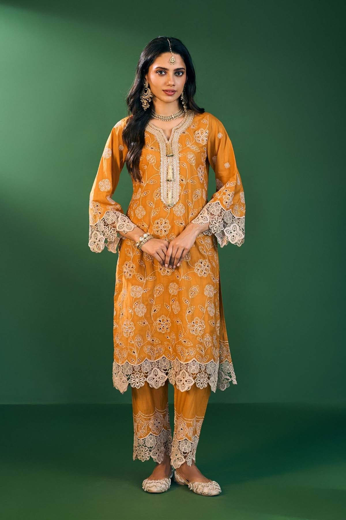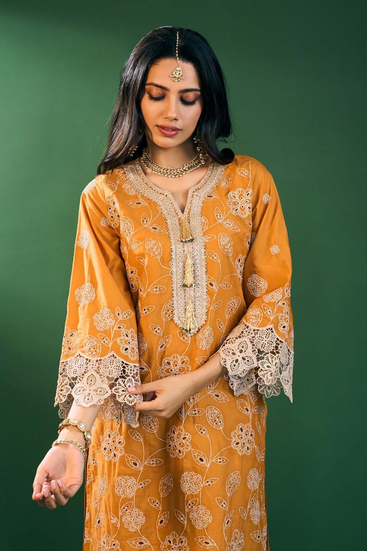 A festive staple in the brightest shade of mustard. This straight-cut supima cotton kurta is brought to life with delicate threadwork and lace inserts, while the scalloped borders at the hem and sleeves add that touch of romance. Paired with straight cotton pants, it’s a set that feels airy, detailed, and just right for rituals that last from sunrise to moonrise. In every size, the top and bottom lengths are an additional half inch.