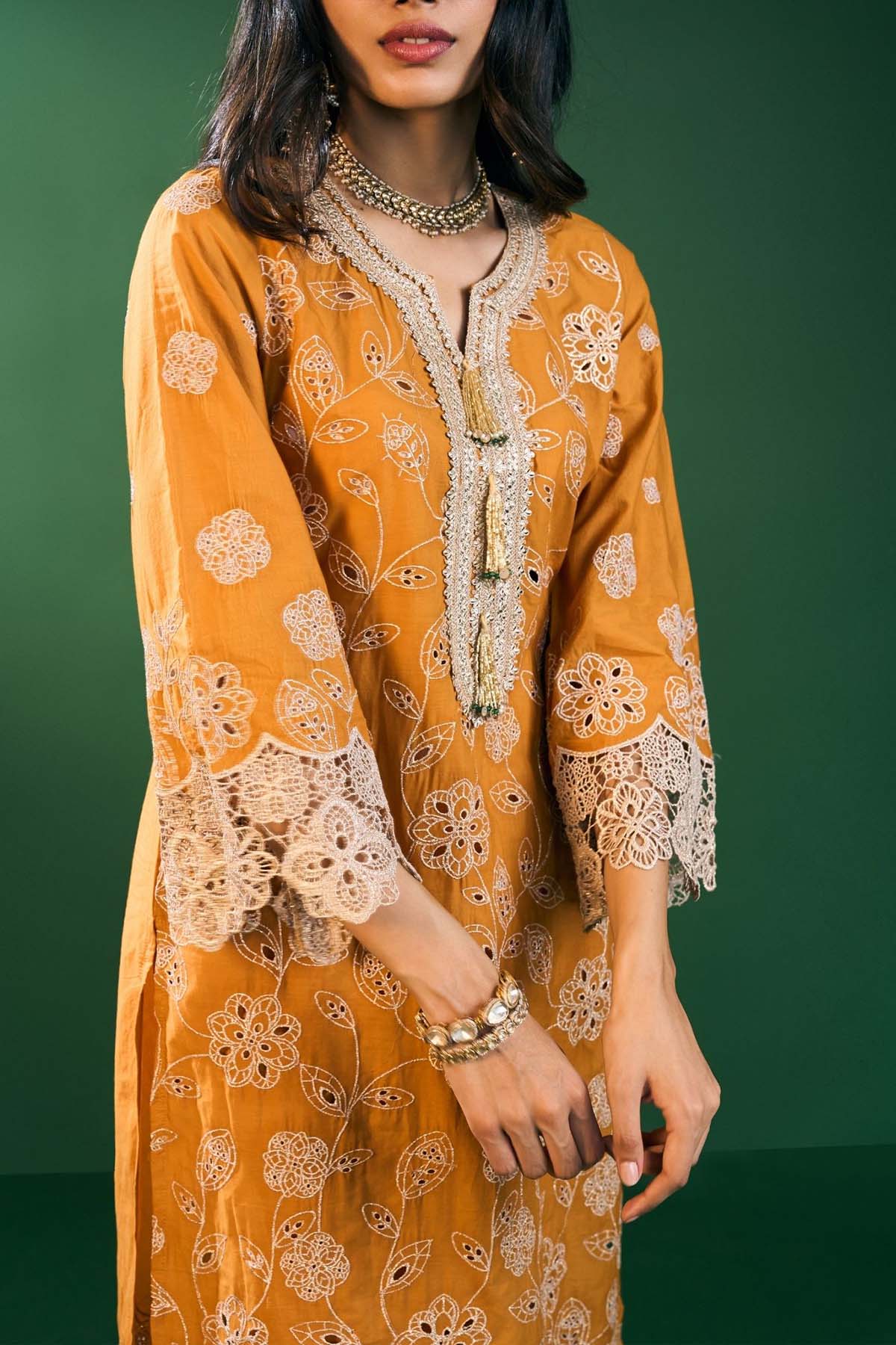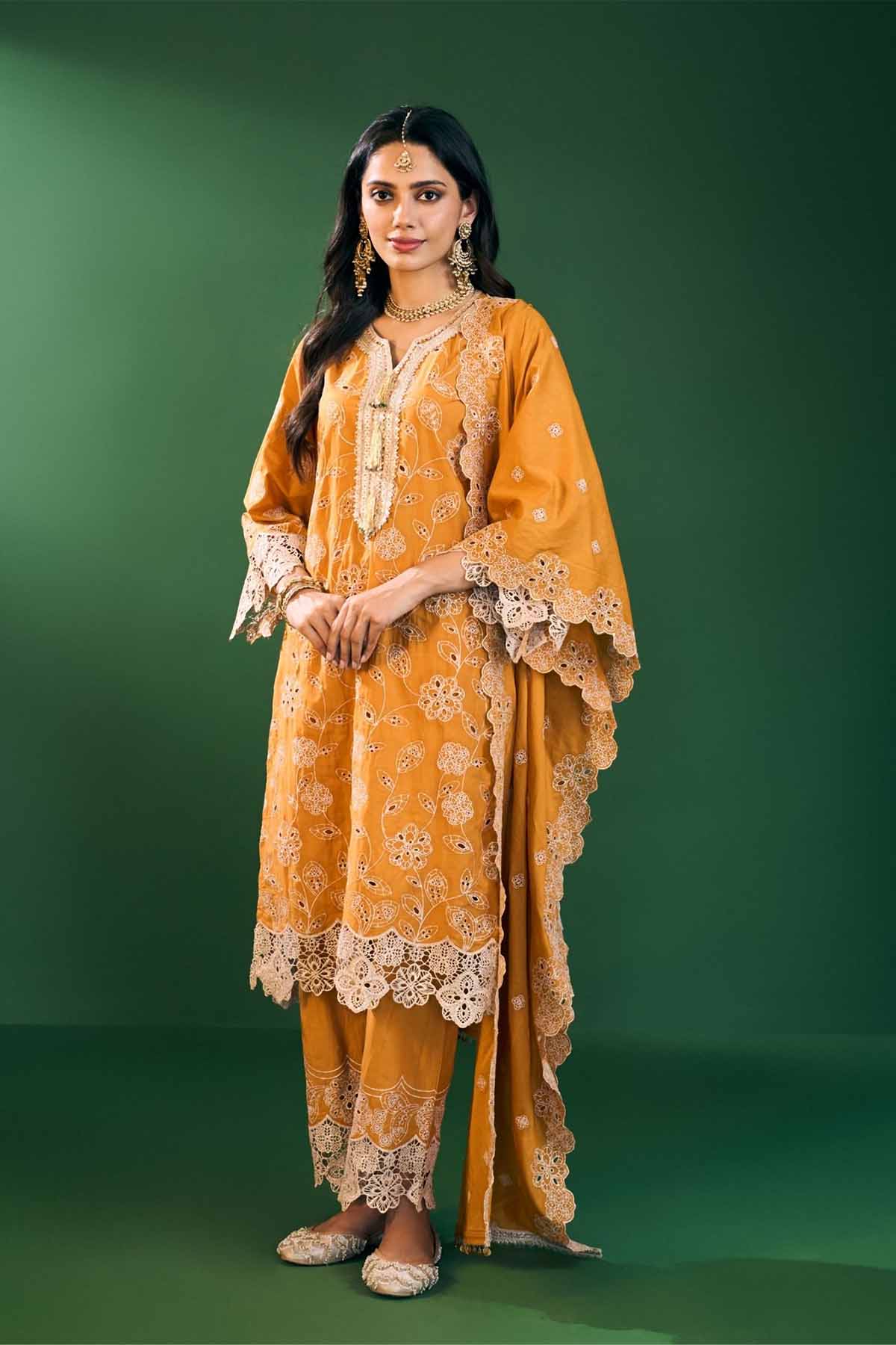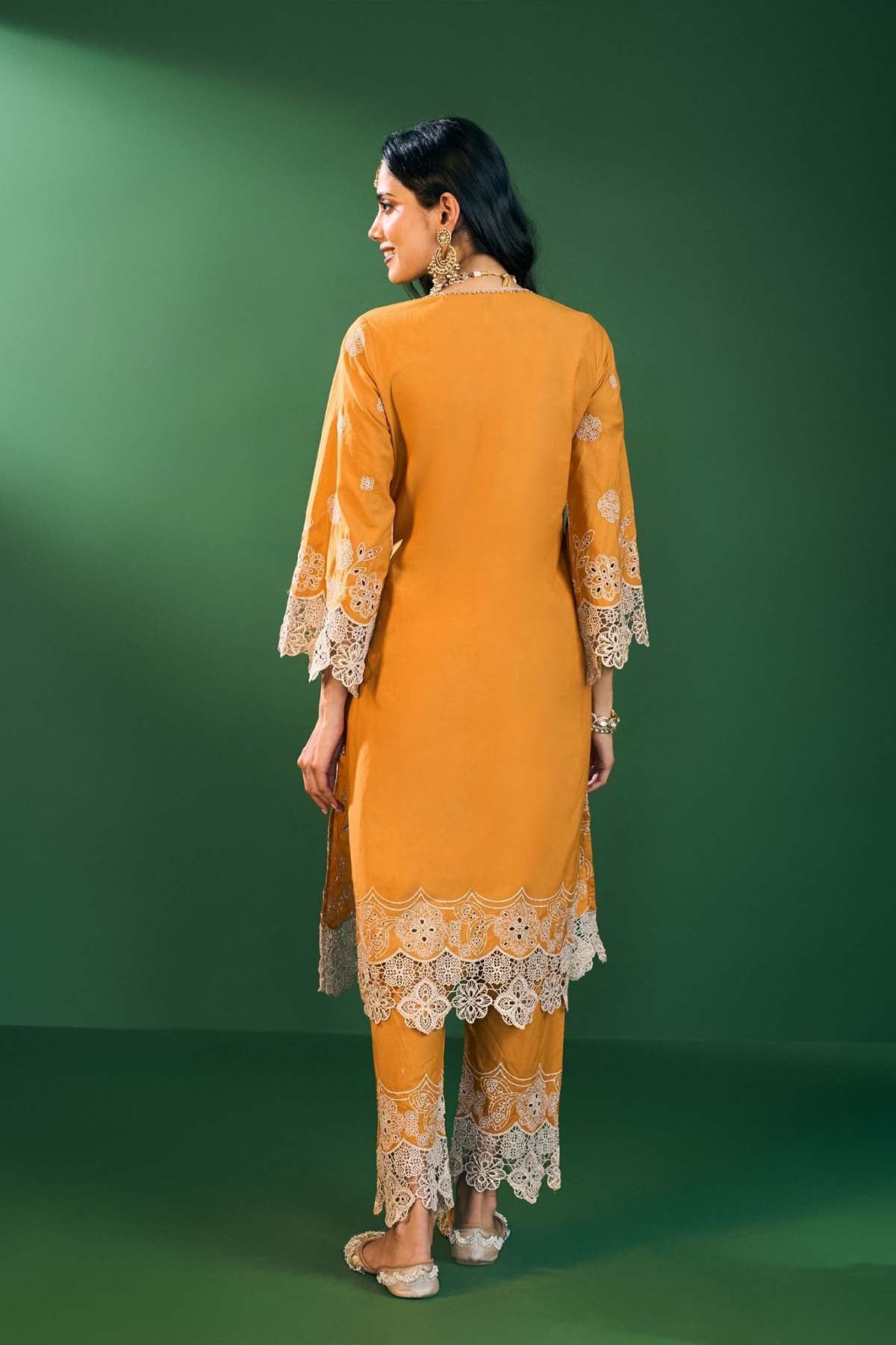 A festive staple in the brightest shade of mustard. This straight-cut supima cotton kurta is brought to life with delicate threadwork and lace inserts, while the scalloped borders at the hem and sleeves add that touch of romance. Paired with straight cotton pants and a matching mustard dupatta edged with lace, it’s a set that feels airy, detailed, and just right for rituals that last from sunrise to moonrise. In every size, the top and bottom lengths are an additional half inch.