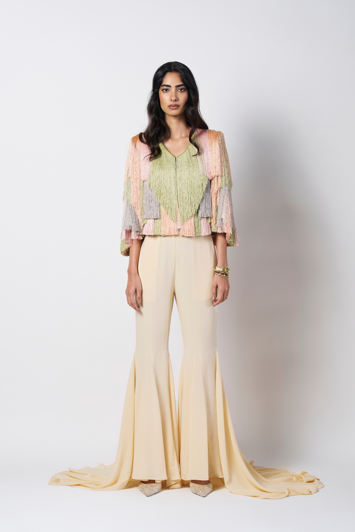 A handcrafted statement cape delicately made with a silk base and fringes of different colours from the shoulder to the waist. Structured with padded shoulders, it sits comfortably over your body. The base of the cape fits well on the body and the fringe moves with you. Wear it over anything to add drama to your outfit.